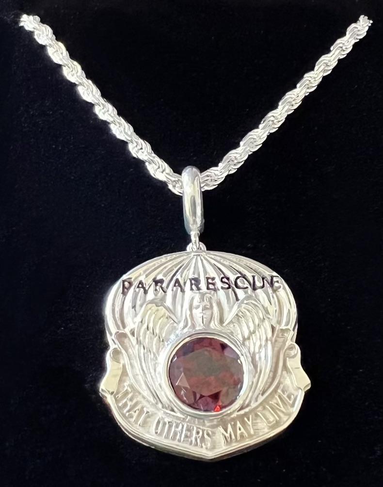Awesome new Additions Custom made unique Pararescue jewelry. Each piece is specially designed in silver or gold metals and all are hand crafted by jewelry designer experts. Pendant does not come with a Chain, order that separatly based on size or use your own. Please indicate Pin or Pendant. These prices are a one time offer for the Reunion. Direct price from the Jeweler and are for current Members. |