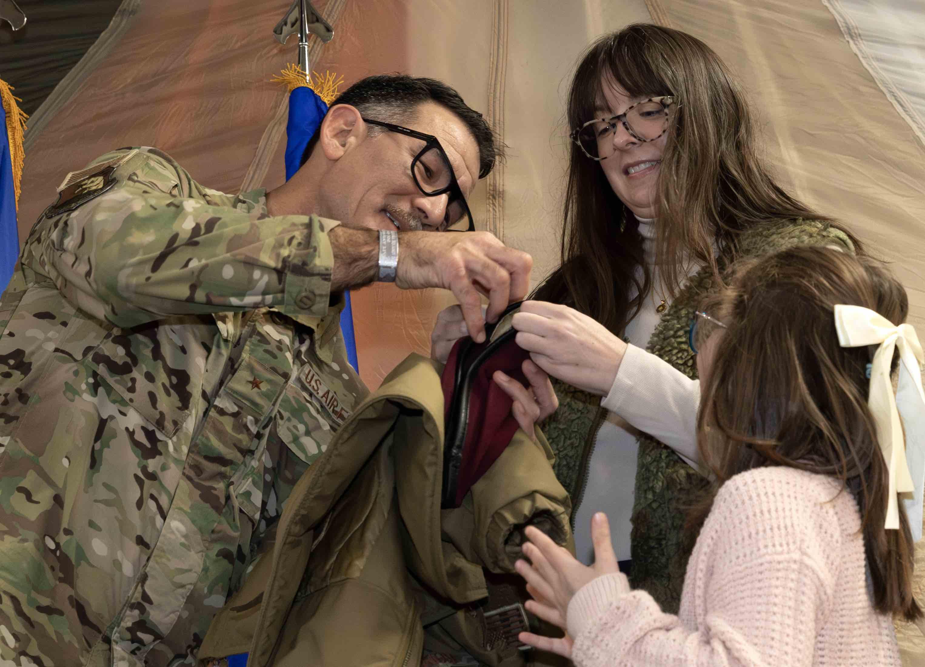 Brig. Gen. Matthew Komatsu gets some help from his family to pin his new star on his beret.
